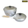 Горнятка, тарілки та столові прибори з нержавіючої сталі. Казанок для юшки та сковорода для смаження м’яса, риби чи овочів, виготовлені з жаростійкого харчового алюмінієвого сплаву.