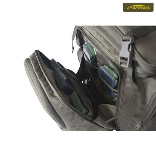По боках Акрополіс СДС-3нбк – сітчаста кишеня для пляшки з водою та 3 окремі секції для рибацьких інструментів, які маю бути під руками в процесі риболовлі.